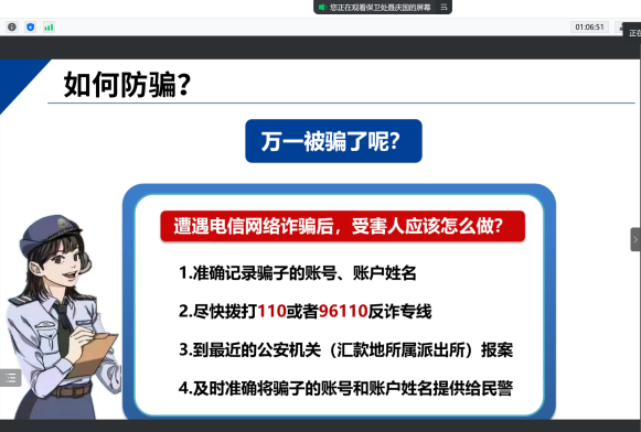 最后聂老师从多个层面深入分析了大学生受骗的原因,并精准归纳为个人信息保护的缺位。以守则、反问的形式为同学们贯彻了防骗手段,并提供了受骗后的具体做法。