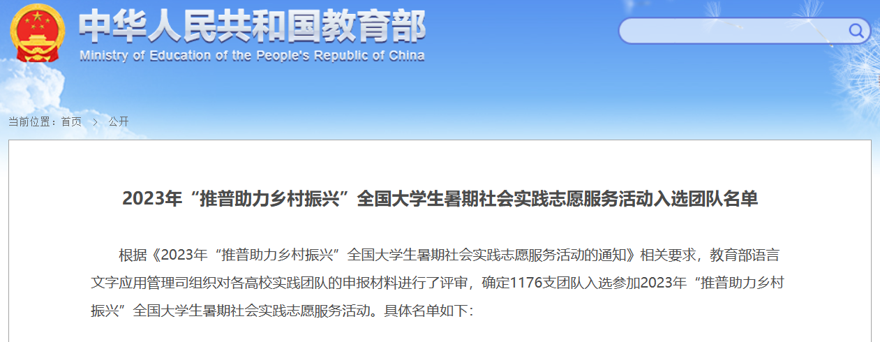 为深入学习贯彻落实党的二十大精神,贯彻落实习近平总书记关于教育的重要论述和关于语言文化的重要指示批示精神,加大国家通用语言文字推广力度,助力乡村振兴战略实施,教育部语言文字应用管理司、共青团中央青年发展部联合开展2023年“推普助力乡村振兴”全国大学生暑期社会实践志愿服务活动,我部两支志愿服务团队成功入选。