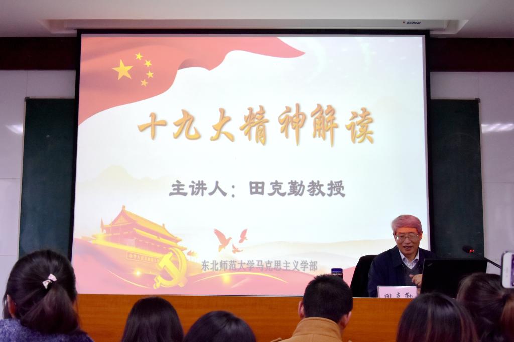 在十九大召开期间,学部党员活动室全天播放党的十九大的电视节目,组织教师和学生踊跃收看。十九大胜利闭幕之后,学部第一时间邀请全国马工程首席专家田克勤教授做题为“十九大精神解读”的专题报告会。田克勤教授从新时代我国社会发展的历史方位、新时代中国共产党的历史使命、习近平新时代中国特色社会主义思想和基本方略、全面建设社会主义现代化国家新的历史征程四个维度展开,对十九大报告进行了系统的导读与深入阐释。除组织师生现场聆听讲座之外,学部还首次通过QQ空间进行了网上现场直播,线上线下观看人数达2000余人。