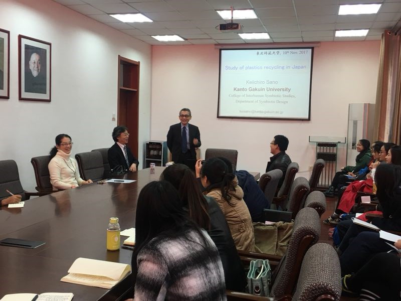 佐野庆一郎教授报告的主题是“日本的废物再循环利用问题”。佐野教授介绍了日本的生活废弃物、医用废弃物、航空港废弃物中的塑料制品回收和再循环利用的具体措施,同时在场师生与佐野教授和施教授探讨了社会转型过程中的环境治理、环境教育与引导等问题,为师生关于学术研究、社会问题研究提供了新视野、新思路。佐野教授的报告深入浅出、详实生动,内容清楚简明、语言幽默风趣,很好地拓宽了学部师生的研究视野。