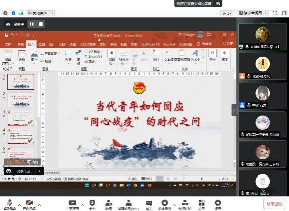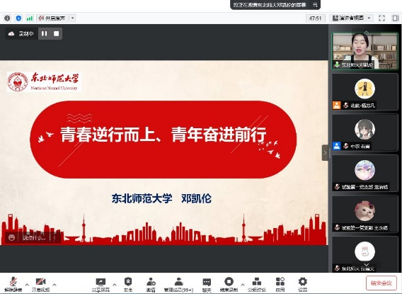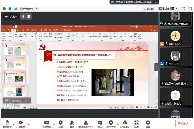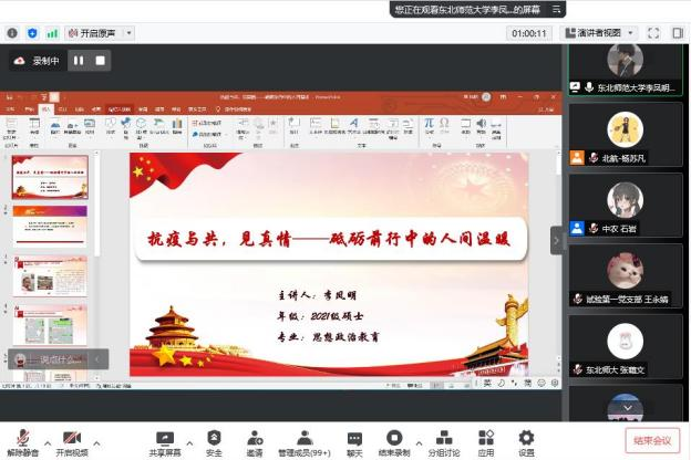 学部2021级研究生党支部副书记邓凯伦讲师作青春逆行而上,青年奋进前行”主题宣讲。她结合自己在前期吉林疫情爆发,东北师大实行静态管理期间志愿服务的经历,讲述身边青年学子的抗疫故事,生动阐释了在这场疫情大考面前中国青年的无限可能,向吉林战疫的东北师大青年学子致敬。她表示,青年一代,正在用自己的方式在这场抗疫防疫战争中发光、发热。今天的中国青年,就是中国明天的模样,而明天的中华民族也必然可以将今天青春故事镌刻在文明的史书中生生不息、世代相传!
