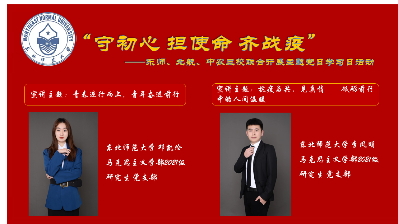 学部2021级研究生党支部党员李凤明讲师作“抗疫与共,见真情——砥砺前行中的人间温暖”主题宣讲。他以自身疫情志愿服务经历为切入点,讲述了东北师大师生在前期吉林疫情爆发期间同心抗疫的故事,带领大家感受疫情期间师生无私奉献和昂扬向上的精神力量。他激励北航和中农的青年学子坚定战疫信心,在现阶段北京新一轮疫情中,以实际行动为打赢抗疫阻击战、校园稳定保卫战贡献青春力量。
