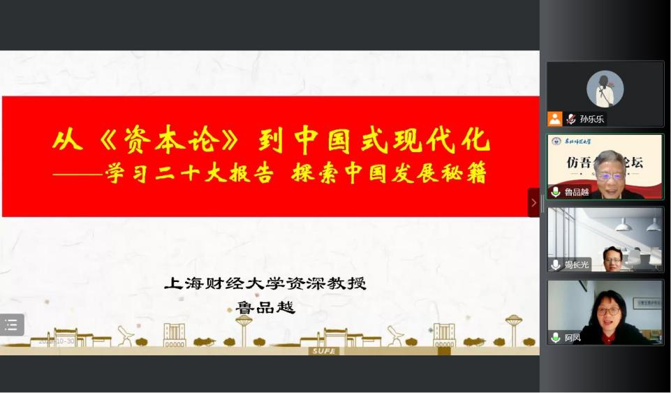 马克思主义基本原理学科主办“仿吾名家论坛”建设系列讲座如期举行。本次讲座邀请了全国经济哲学研究会副会长、上海财经大学资深教授鲁品越教授主讲,以“从《资本论》到中国式现代化:社会主义的历史使命”为题进行学术报告。此次讲座采取线上形式,线上共有300余师生参加了讲座。讲座由调教小说