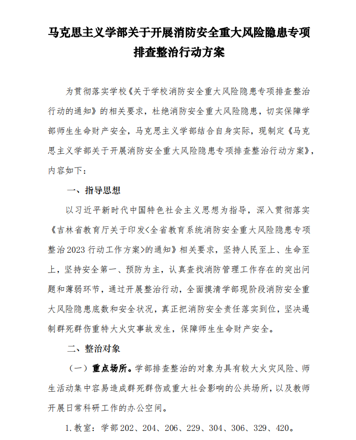 制定工作方案。制定关于开展消防安全重大风险隐患专项排查整治行动方案。坚持安全第一、预防为主,认真查找消防管理工作存在的突出问题和薄弱环节,通过开展整治行动,摸清学部现阶段消防安全的风险隐患底数和安全状况,真正把消防安全责任落实到位,保障师生生命财产安全。