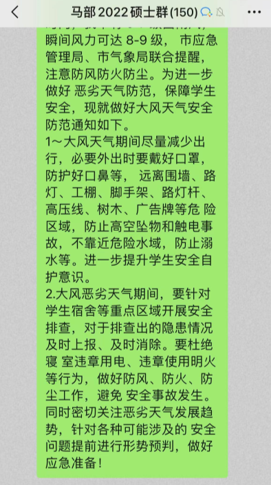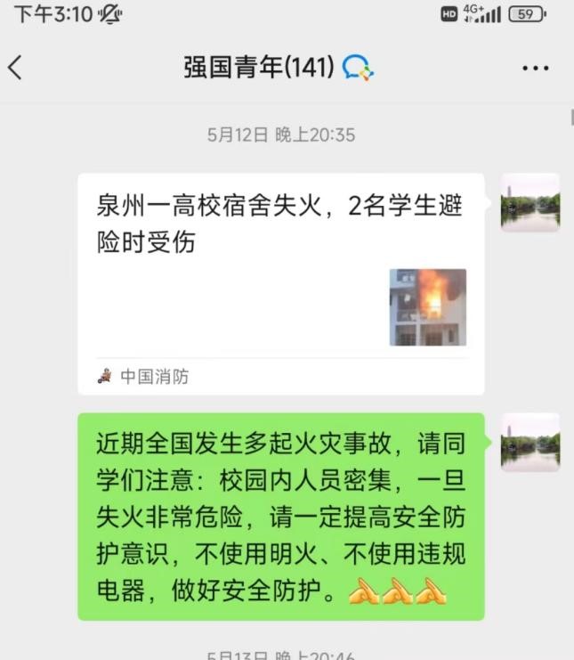 通过年级会、微信等方式发布关于消防安全教育内容,开展消防知识宣传教育工作。在年级会上各年级辅导员嘱咐学生在宿舍不违章用电,不使用窗帘,不放置易燃易爆物品,注意酒精等消毒产品的存放,注意喷雾、防晒喷雾等易燃易爆物品的存放,并明令禁止在宿舍、教学楼、图书馆等室内场所吸烟。在微信群内不定期多次发送防火安全系列推送,并号召大家积极学习防火知识。