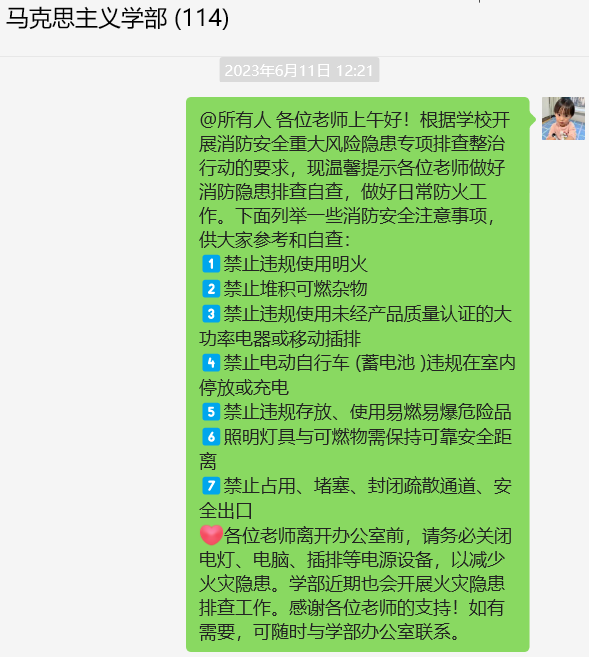 开展学部防火安全隐患自查。学部主管行政副部长、办公室联合保卫处防火负责同志对学部公共区域的防火安全隐患进行排查并进行了全学部的自查动员。全面开展消防安全自查工作并及时整改,对消防设施和电气设施进行全面维护保养。