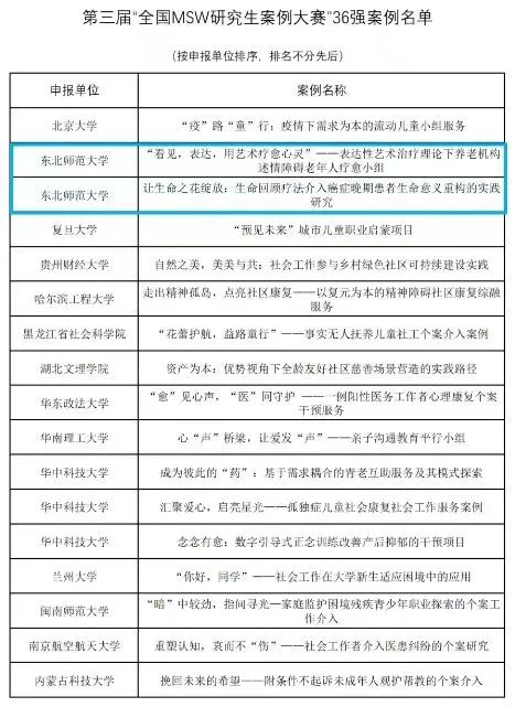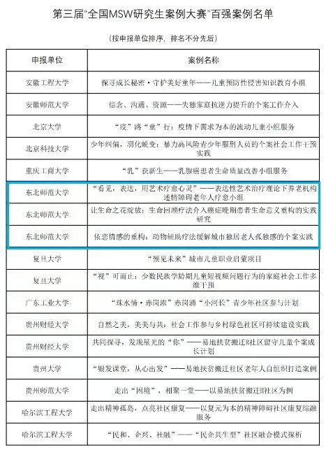根据《关于举办第三届“全国MSW研究生案例大赛”的通知》的要求,初赛采取“通讯评选”的形式。根据综合评分结果,评选出了百强案例,共有72所MSW研究生培养单位的案例入选。