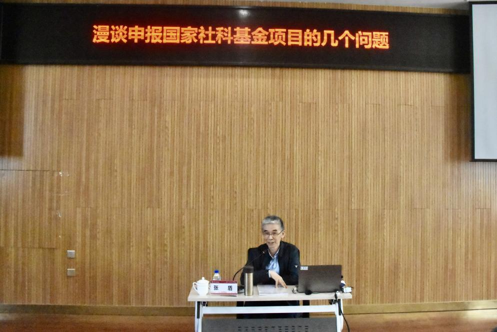 讲座围绕“申报国家社科基金项目难在哪里?”“怎样写一般项目申报书?”“怎样写重大项目申报书?”三个问题展开。张盾教授指出项目申报的难点在于“选题”“论证”和“前期成果”。首先,选题应有创新性,原创性和学术性,与学科前沿问题相结合,具有一定的关注度和共通感。其次,在论证时要坚持专业、清楚、平实三个原则,具有较强的专业性和学术性,思路清晰,结构合理,行文简洁,要对问题研究的总体趋势有高度概括的能力。最后,前期成果是学者长期的学术积淀的实力体现,对于国家社科基金重大项目而言更加重要,要对本领域发展的历史和现状有全面准确的把握,抓住本领域最重要最关键最前卫的问题。总之,扎实的知识基础,深厚的学术积累是项目申报成功的关键。