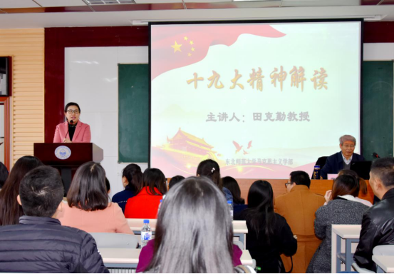 从2017年10月18日上午9:00到10月24日12:30,为期一周的中国共产党第十九次全国代表大会胜利闭幕。为了深入学习和贯彻落实习近平总书记党的十九大精神,研究生会学研部于2017年10月25日成功举办了“十九大精神解读”的专题讲座。本次讲座我们非常荣幸的邀请到了田克勤教授,讲座现场座无虚席,老师和同学们都认真倾听。
