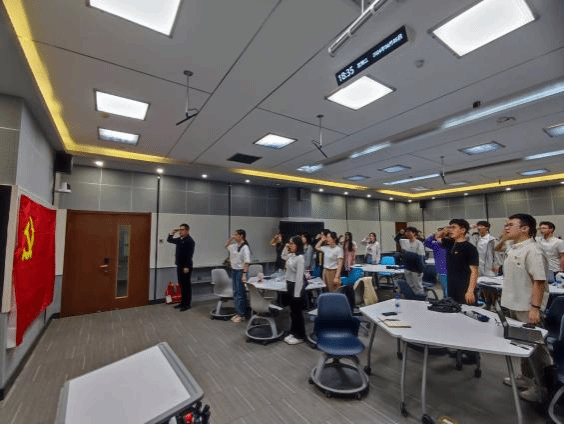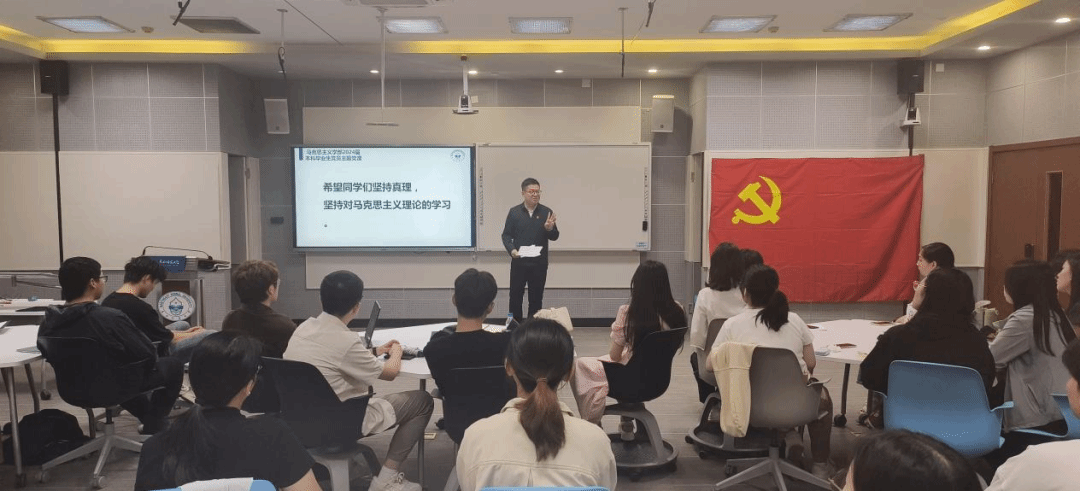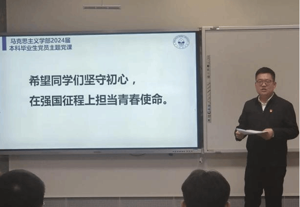 支部书记宋冰以“青春当有凌云志,挺膺担当启新程”为主题为毕业生党员上党课。他带领全体毕业生党员重温了习近平总书记对当代青年的寄语,回顾了2024届学生在校期间经历的一系列党和国家盛事。他引用马克思的中学毕业论文《青年在选择职业时的考虑》,希望同学们一是坚守初心,在强国征程上担当青春使命;二是坚定信念,脚踏实地把每件平凡的事做好,三是坚持真理,坚持对马克思主义理论的学习。毕业生党员代表结合毕业去向开展交流,全体毕业生党员为支部写下寄语。宋冰同志带领党员重温入党誓词。