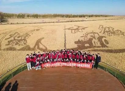 稻田画区域更是给师生们带来了强烈的视觉冲击。同学们站在标有“中国粮食、中国饭碗”的观稻平台上俯瞰,276公顷的稻田画犹如一幅巨大的艺术画卷展现在眼前。讲解员还向大家详细介绍了红光村水稻种植科学运用稻田养鸭、稻田养蟹、稻田养鱼等技术,实现统一育苗、整地、播种、管理的有力举措。